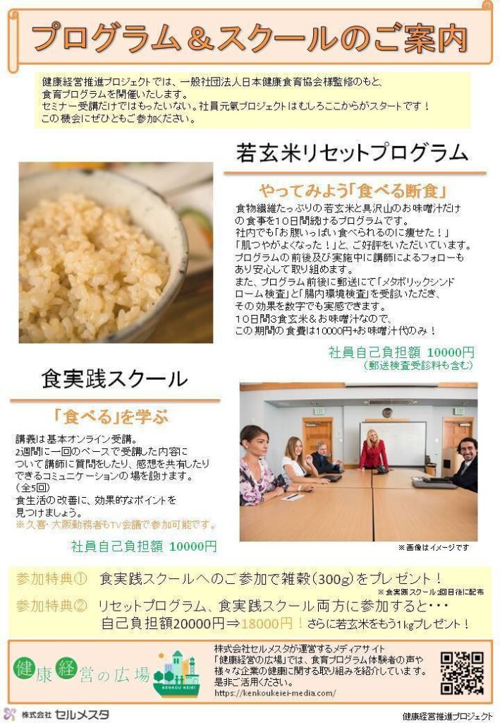 社員元氣プロジェクトは2018年7月から2019年4月まで実施された、セルメスタの従業員向け食育プログラムです。一般社団法人日本食育協会が提供する「若玄米リセットプログラム」と「食実践スクール」の2種類から自分の興味があるプログラムを実践・受講します。