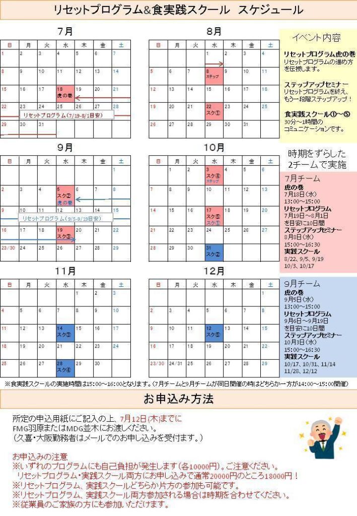 両方のプログラムに参加した場合は約4ヵ月間の長期にわたる実践になるため、今回は従業員それぞれの生活スタイルに合わせて7月スタート、9月スタート、1月スタートとスタート時期を3回に分けて行いました。実践にかかる費用の一部は会社が補助します。