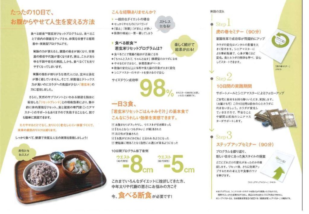 若玄米リセットプログラムは若玄米+雑穀のご飯、具だくさんの味噌汁、ちょっとしたご飯のお供のみの食事を1日3食、10日間続けるというプログラムです。このシンプルな食事を続けることでカラダのリセット・デトックスを図ります。