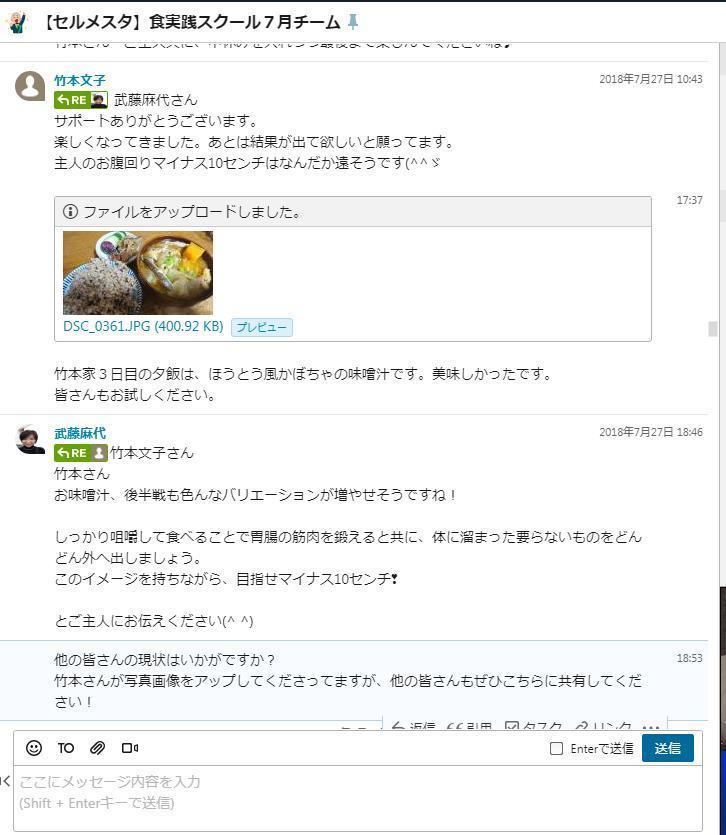 日々の食事の写真をアップしたり、実践する上での悩みや相談を投げかければ他のメンバーからの反応や、プログラムをサポートしてくれる講師からのアドバイスが返ってくるようにチャットアプリを使用しました。「味噌汁にこんなものを入れてもいいんだ」「これ私も気になってたけど○○さんが聞いてくれたおかげでよくわかりました」といった気づき、発見を共有でき、プログラムを進めていく上で励みになったようです。