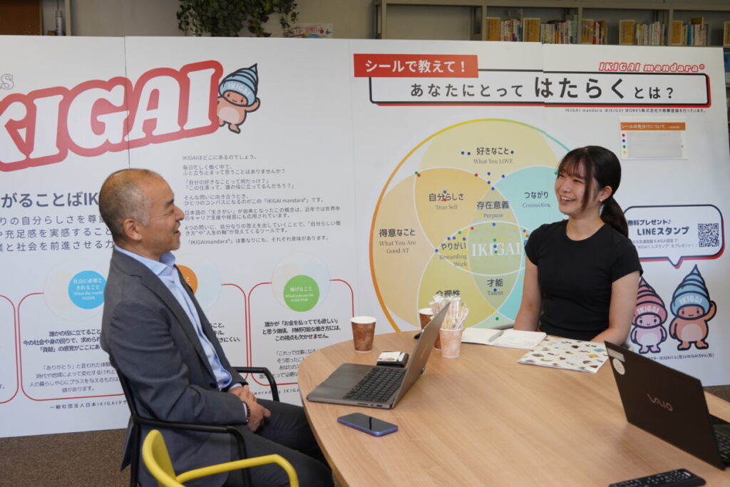 イベントのハイライトは、株式会社アワーズ(アドベンチャーワールド)でのインターンを終えた教育学部3回生の田端さんと、日本IKIGAIデザイン協会の熊倉代表理事によるセッションでした。ここで用いられたのが、自身の価値観を整理するツール「IKIGAImandala™」*¹です。