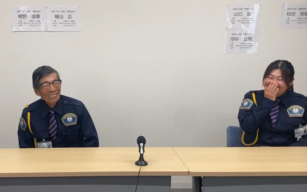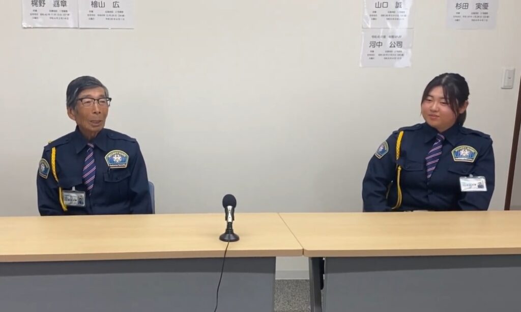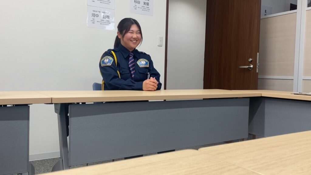 有田さん:はい。向かって右側は、杉田 実優警備士です。彼女は広島県の女子大を卒業し、昨年4月に新卒で入社しました。