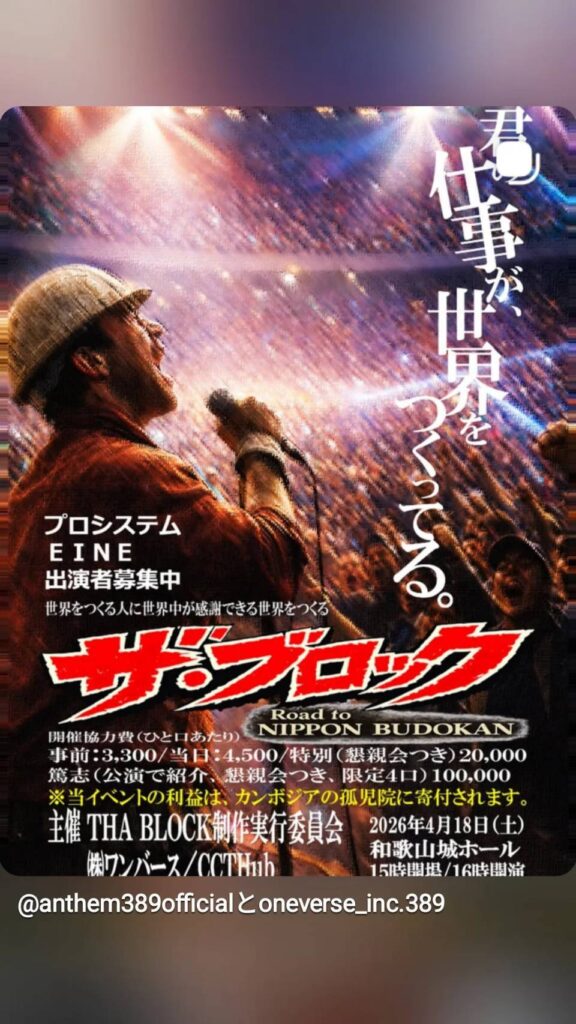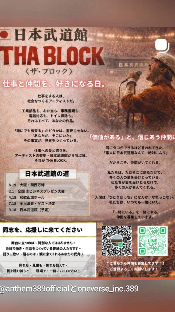 山泊さん:はい。僕は、日常という「作品」を作っているすべての働く人を、晴れの舞台に立たせたいんです。それが、2026年9月18日の開催を目指している、日本武道館でのイベント「THA BLOCK」です。